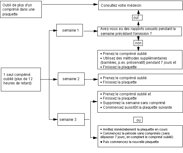 · Si l'oubli d'un comprimé est constaté plus de 12 heures après l'heure habituelle de la prise, il existe un risque de grossesse. Plus le nombre de comprimés oubliés est élevé, plus le risque de tomber enceinte est important.